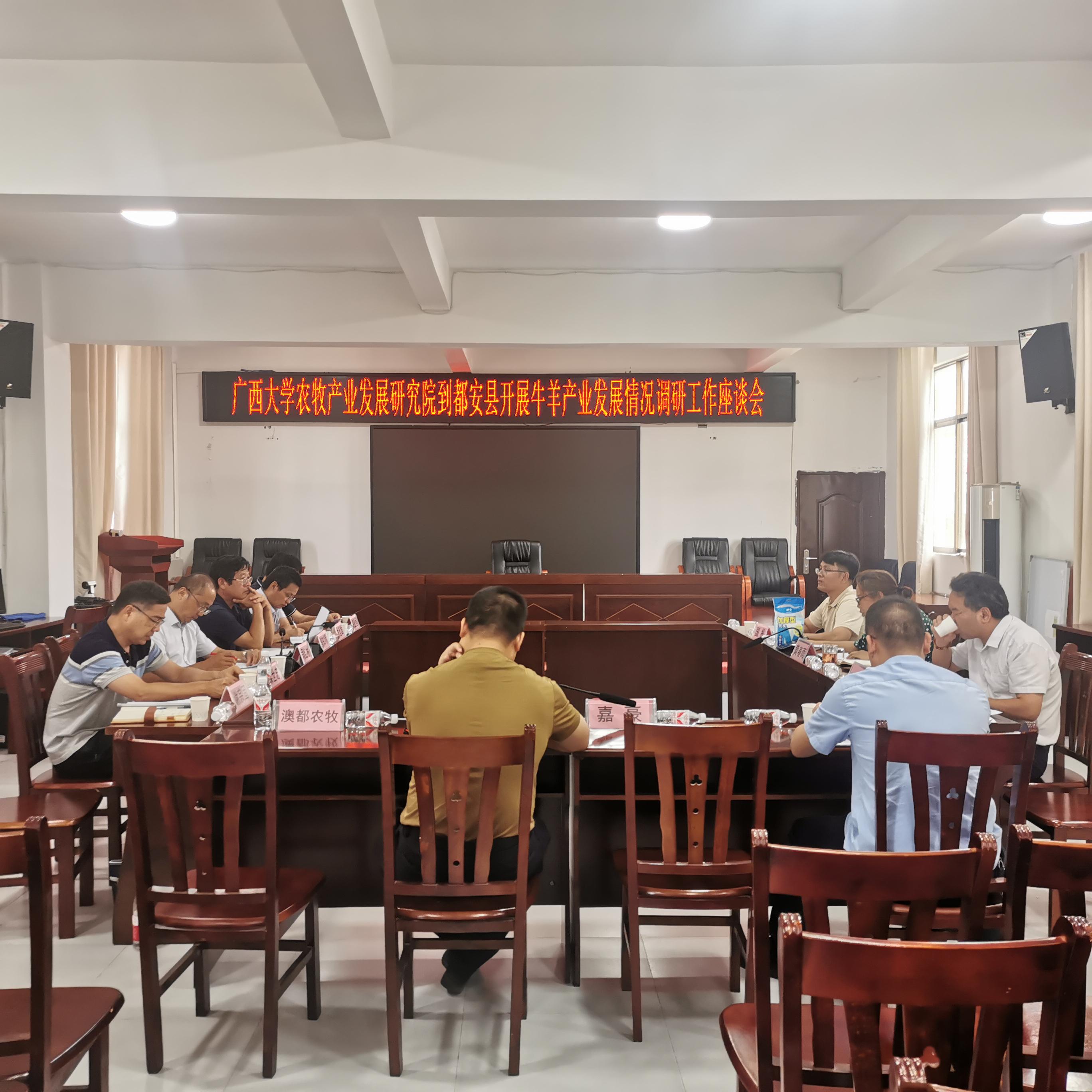 下午调研组与县牛羊产业主管部门、牛羊产业龙头企业代表在县农业农村局就都安县牛羊产业发展情况展进行座谈。黄春雨副局长介绍都安县牛羊产业情况,都安县国有资产投资管理有限公司、都安县农林旅游投资有限公司、广西嘉豪实业有限公司、都安澳都农牧有限公司、广西桂合泉农牧有限公司分别介绍产业发展情况和问题困难,并提出相应需求。与会代表就牛羊产业进行了讨论交流,调研组专家就问题和需求提出指导性建议,归纳出4个专题进行深入研究,助推都安县牛羊产业高质量发展。