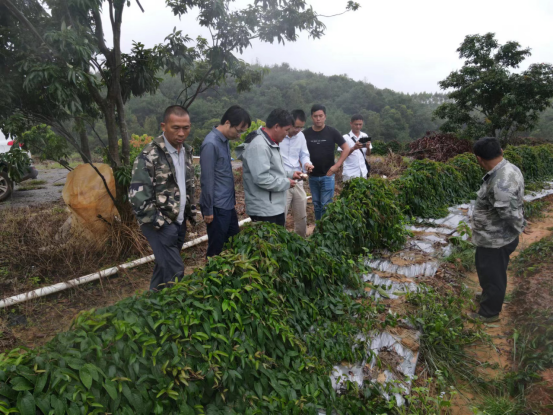 2023年10月10日,院党委书记、国家中药材产业技术体系山药桂南综合试验站站长何龙飞教授一行到钦州市钦北区新棠镇淮山种植基地指导生产。该基地约450亩,为退桉还耕山地,部分采用了试验站选育的新品种,以及定向种植、小拱架栽培新技术,5月份种植,通过查看植株长势、块茎外观和切面等情况,发现总体表现较好,但仍存在少量种薯带来的线虫病,因喷施不均匀引起的控苗效果不一致。建议后续仍要加强控苗和防控病害发生。