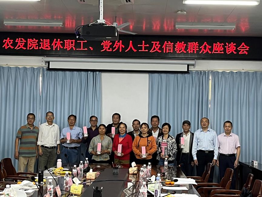 为深入学习贯彻党的二十大精神,严格落实上级党委关于加强退休干部管理服务工作的有关规定和中央统战工作会议精神,进一步增强退休教职工的政治荣誉感、组织归属感以及广泛征集党外人士、信教群众对我院工作的意见建议,11月25日上午,在院领导班子的精心组织下,我院在农科新城召开退休职工、党外人士及信教群众座谈会。