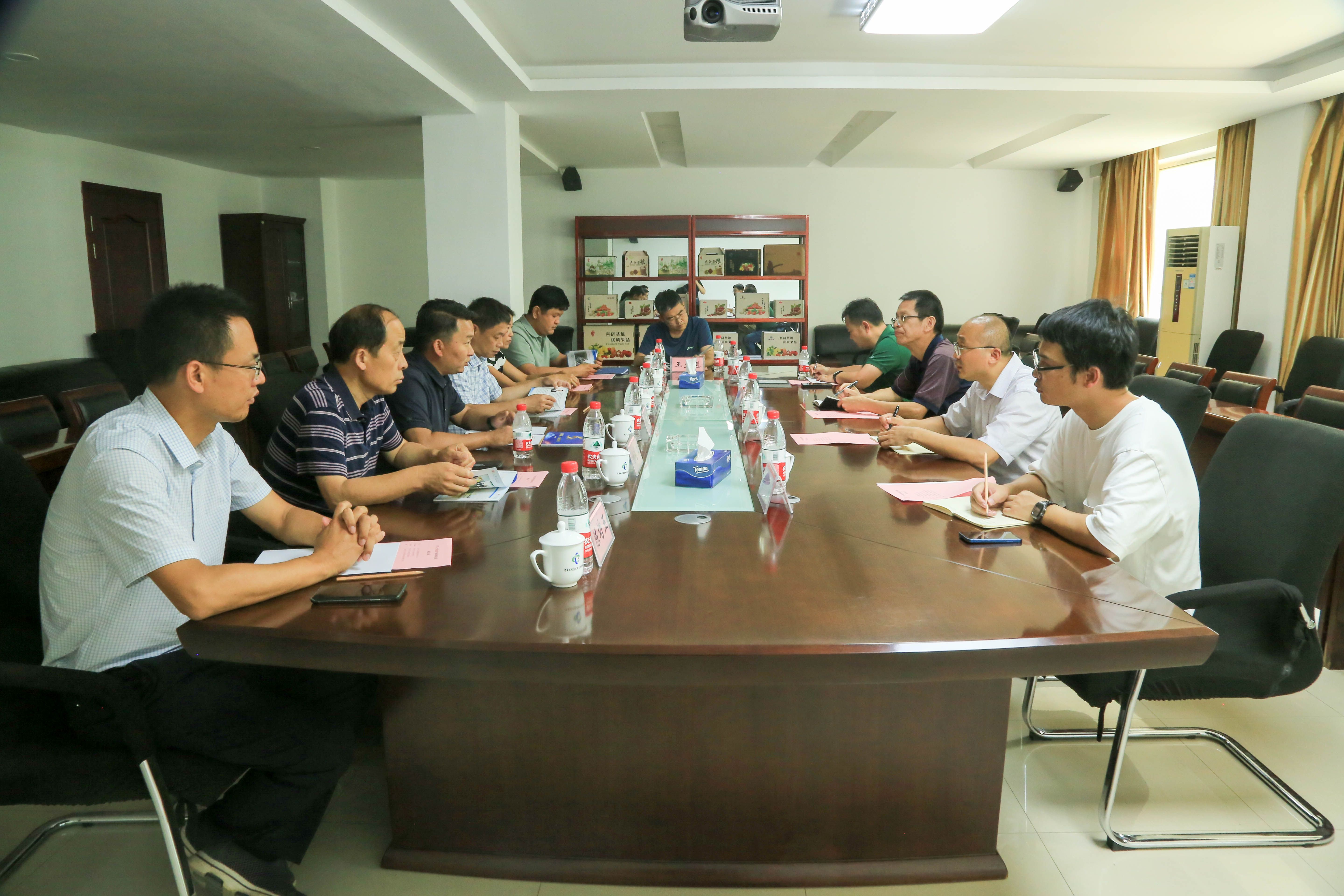 在河南省农业科学院现代农业科技试验示范基地,院领导一行重点调研了解园区规划、信息化控制中心、园艺研究所、国家梨产业体系郑州综合试验站、河南省中药材种质资源库、田间服务站等。座谈会上,双方就基地管理与服务中心的组织架构、人员组成及园区规划、运营管理模式、土地管理制度、院企合作经典案例等方面进行了坦诚交流。