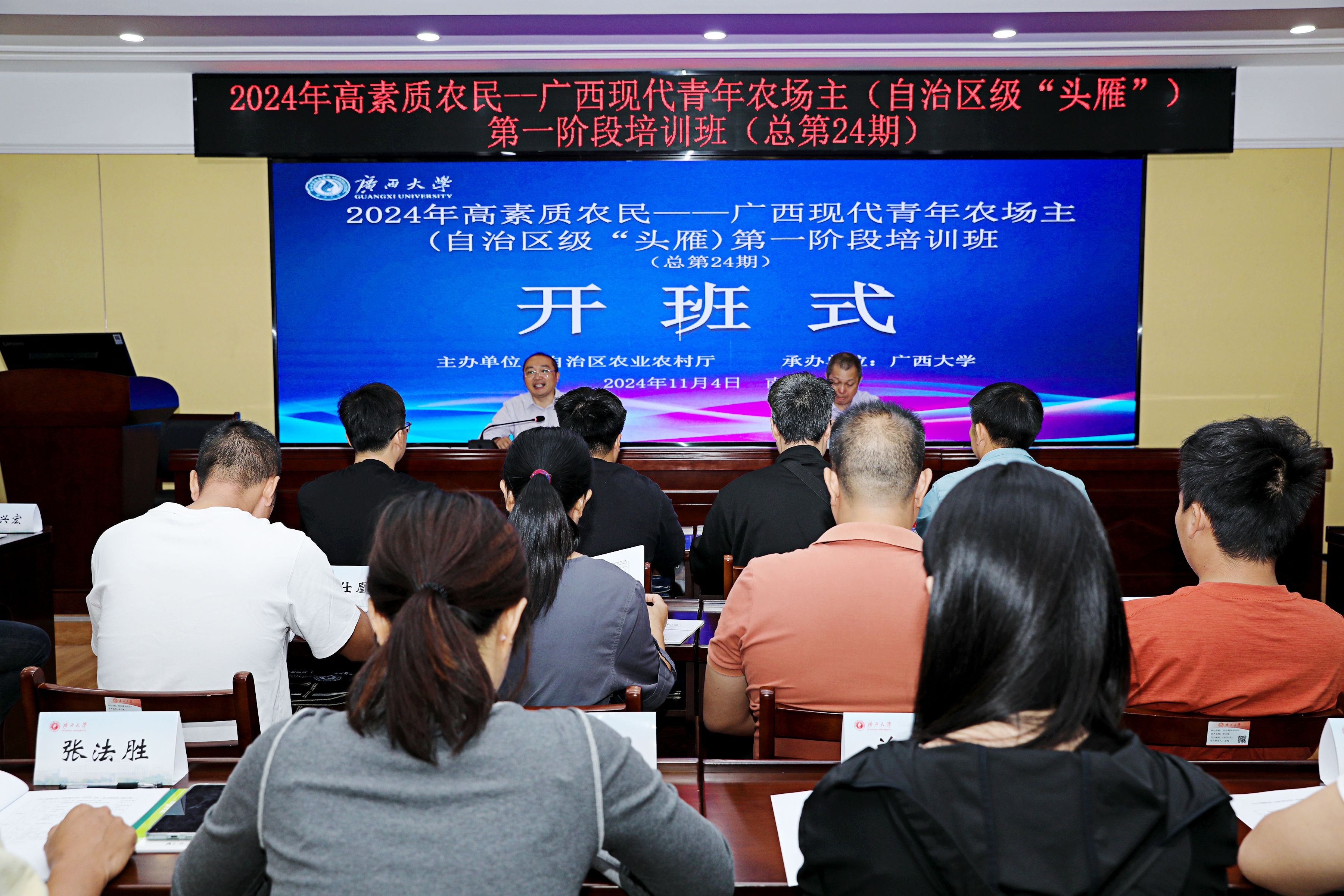 11月4日,2024年高素质农民--广西现代青年农场主(自治区级“头雁”)第一阶段培训班(总第24期)在我院顺利开班,此次培训班不仅是对乡村振兴战略和人才强农理念的一次深刻实践,也是推动广西现代农业发展的重要举措。