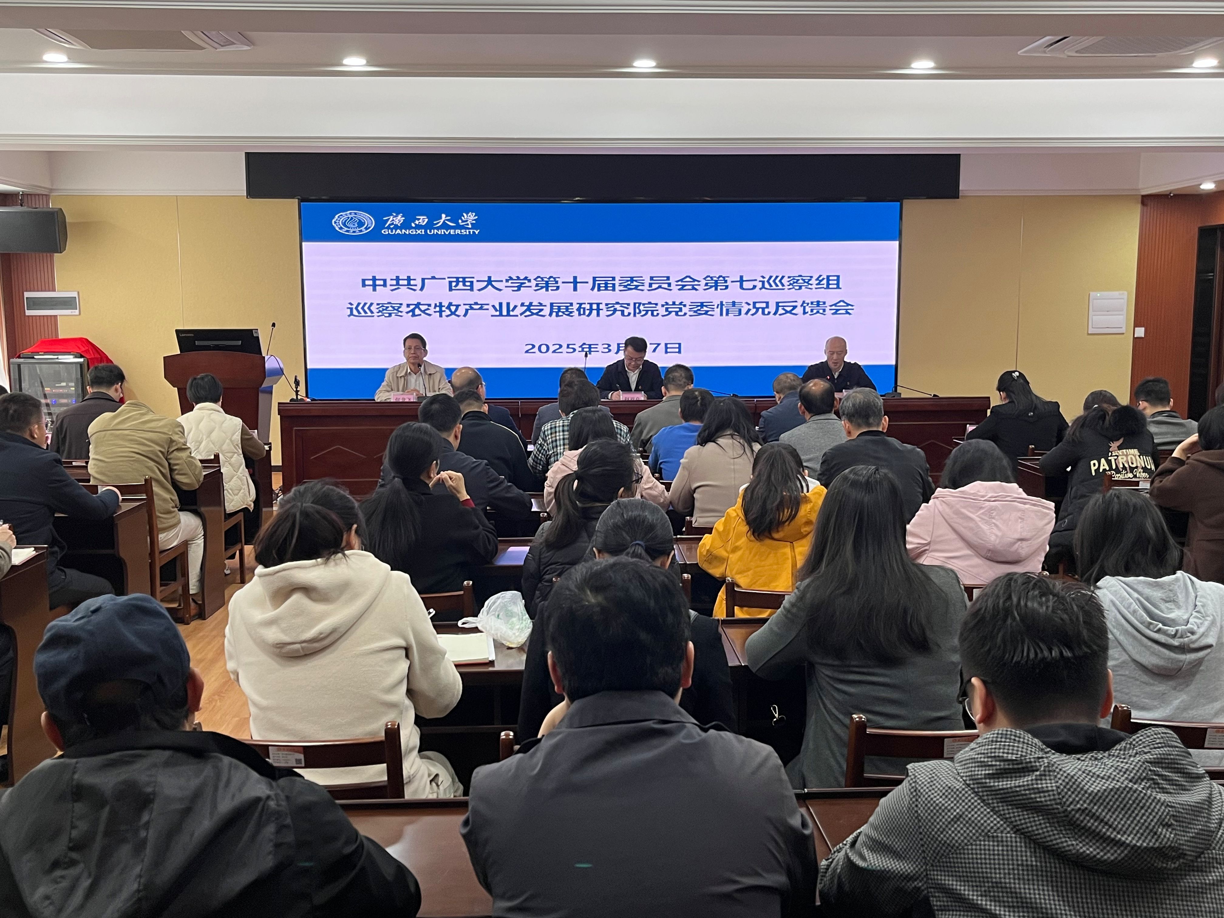 3月17日,中共beat365手机版官网入口第十届委员会第七巡察组巡察农牧产业发展研究院党委情况反馈会在我院召开。校党委常委、副校长赵双良,校党委第七巡察组组长陈泽军,自治区纪委监委驻beat365手机版官网入口纪检监察组副组长、校纪委副书记王运东,校党委巡察办副主任周誉,校党委第七巡察组全体成员以及我院全体领导班子和职工(含近三年的退休职工)参加了此次会议。会议由院党委书记何龙飞主持。