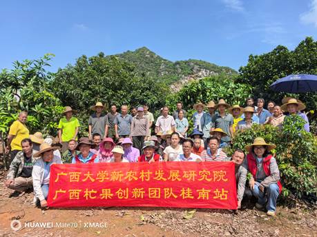 儒浩村和那徐村示范园是我院罗慧芒果团队长期以来持续建设的村屯示范园,多年来丰产稳产优质,在桂南、桂东南等区域芒果种植圈内享有良好声誉。在今年花期出现持续一周高温(日最高温度≧32℃)及去年10月至今年4月持续干旱(60年一遇)的情况下仍能获得高产优质,实为不易。在观摩现场,广大果农和村民看到挂满枝头与光洁美观的果实后纷纷称赞,对今年如此干旱的情况下还结果那么多且果实外观光洁表示佩服,认为栽培技术效果显著。在观摩培训现场,儒浩村和那徐村示范园主人均介绍建园以来的情况、今年花期期间拉水淋树以保障授粉受精等措施;罗慧介绍技术指导的形式、时间段、技术要领等内容,然后引导果农观摩丰产树形、主枝数量以及分布方向和角度、促花时环剥(环割)的位置与作用等,在实行“减肥减药省工节本”栽培模式的那徐村示范园还着重介绍农发院自主创建的“减肥减药省工节本”栽培模式在今年特大旱情情况下的保水保肥优势及对促进坐果的显著效果。