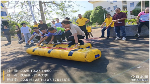 活动现场气氛活跃,职工踊跃参与。活动围绕校运会团体项目,设置了多项集体训练环节。“颠鼓击球”项目中,队员们配合默契,击球节奏有序,展现出良好的团队协作能力;“跳长绳”环节,大家身姿轻盈、衔接流畅,现场洋溢着欢声笑语;“同舟共济”项目考验团队的平衡与配合,各小组步调一致、齐心前行,展现出强烈的集体意识;在“男女混合接力投篮”中,队员们传球精准、投篮稳健,赢得阵阵掌声。各项活动不仅锻炼了职工身体素质,也进一步提升了团队凝聚力。