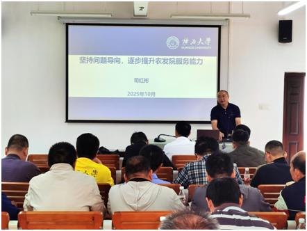 随后,院长司红彬作《坚持问题导向,逐步提升农发院服务能力》主题报告。报告系统梳理了当前在内部管理、服务效能及协同机制等方面存在的突出问题。司红彬强调,全体教职工必须坚持问题导向,主动担当作为,将提升农科新城运营服务能力作为核心抓手,切实推动农发院各项事业实现高质量发展。