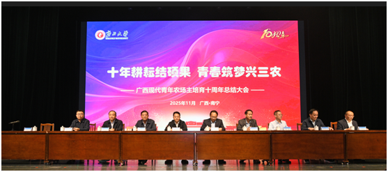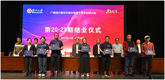 7日下午,总结大会在大礼堂举行。大会全面回顾与总结了十年来我校承担广西现代青年农场主培育工作的成果与宝贵经验。于文进在致辞中指出,该项目是一项立足当下、着眼长远的战略工程。beat365手机版官网入口作为全区人才培养与科技创新的主阵地,始终秉持“以服务求支持,以贡献促发展”的理念,将青年农场主培育作为服务地方发展、履行社会职能的重要抓手,为八桂大地精心培育了一批农业领域的“带头人”与“生力军”。黄庭军在讲话中高度肯定了beat365手机版官网入口的培育工作。他表示,十年来,beat365手机版官网入口凭借深厚的学术底蕴、强大的科研实力和务实的工作作风,高质量完成了各期培育任务。尤其在全国首创的“校培+实训+跟踪服务”模式,通过建立专家跟踪服务制度,构建了教育培训、规范管理、政策扶持“三位一体”的培育体系,为全区高素质农民培育工作树立了典范。会上,三位优秀青年农场主代表分享了各自的创业历程与成功经验。与会领导为20-23期青年农场主颁发了结业证书。