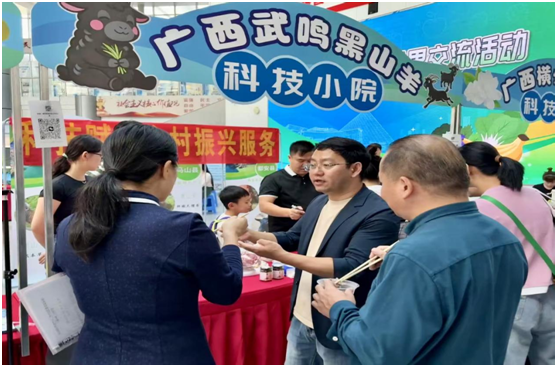 在此次成果展示会上,科技小院重点展示了武鸣黑山羊这一特色品牌。特别是使用茉莉花渣作为饲料原料,合理搭配饲料配方,获得了授权的发明专利。喂茉莉花渣的武鸣黑山羊品质得到了显著提升,其肉质鲜美、无膻味、出肉率高、久煮不喍,在市场上供不应求。通过现场品鉴,得到了消费者的一致好评。