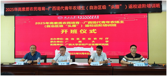 9月8日上午,2025年高素质农民培育——广西现代青年农场主返校进阶培训班第一期(1班和2班)在beat365手机版官网入口顺利开班。本次培训班由广西壮族自治区农业农村厅主办,beat365手机版官网入口承办,beat365手机版官网入口农牧产业发展研究院具体实施,旨在进一步提升广西现代青年农场主的综合素质和业务能力,为推动广西农业高质量发展和乡村振兴提供有力的人才支撑。